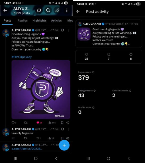 | In November, I published over 90 posts of which includes 9 threads with a minimum of 6 posts per thread and 35 original posts. I have been active in the community and committed to engaging with the PIVX official account on X and all PIVX related posts I come across. My highlight this month being starting a series expanding PIVX partnerships and the benefits of each partnership. I also engaged with high reaching KOLs and influencers, commenting and quoting. Analytics Impressions - 57k+ Likes - 2.1k+ Retweets - 320+ Comments - 347+ Bookmarks - 378+ Engagement - 3.6k |